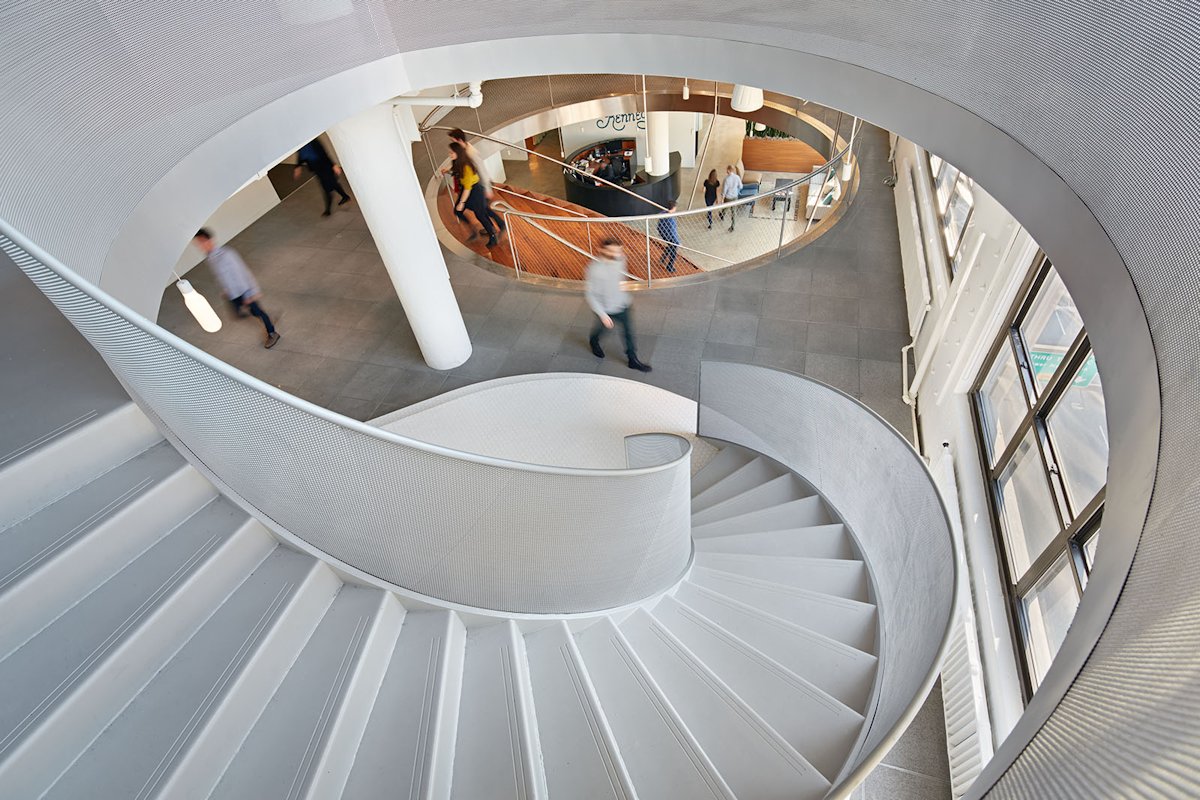 A series of larger collective ‘moments’ are distributed vertically to serve as the connective tissue for the agency. These spaces open up views across the office through circular oculi that create the largest possible openings in the floor slab while minimizing structural impact. Connecting the 6 th & 7 th floors, a circular-shaped, walnut-clad “Coin Stair” features bleacher seating that can accommodate office-wide meetings or informal discussions below a spider-shaped structure that transfers load from a removed column. On the 7th floor, a white-tiled bar provides an opportunity for end-of-day office celebrations. Connecting the 7th and the 8th floors, a perforated metal spiral staircase leads to a generous bamboo-clad, library “den” on the 8th floor.