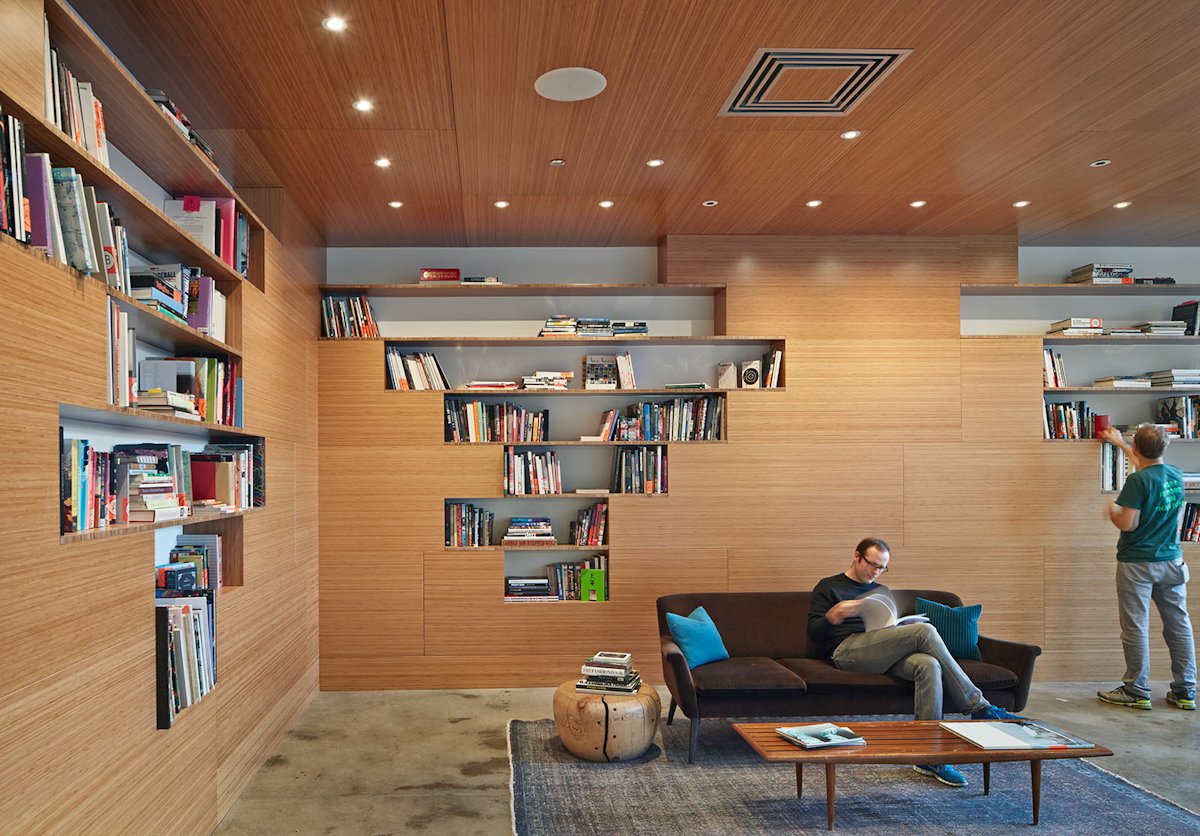 Because work at Wieden+Kennedy is highly collaborative, WORKac designed the widest possible range of discussion spaces to accommodate meetings and gatherings of varying size, privacy levels, and duration. Teams can choose to hold quick reviews standing up at 10 foot long “Over-The-Counter” blackened steel tables; have informal discussions in lounges with comfortable furniture and natural wood floors, raised to different levels to create a sense of privacy; or gather in the kitchens for working lunches. More traditional meetings can be held in conference rooms that range in scale from smaller, intimate “Phonebooths,” to “Picnic-Table” meeting rooms that accommodate up to 10 people to larger, formal “Wide-n-Long” conference rooms. Glass walls create a sense of lightness and transparency to the space. Clusters of these different meeting spaces are organized around groups of 20-25 people in open offices, featuring polished concrete floors.