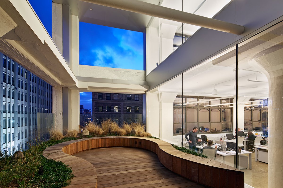To bring the outside in, a double-height space on the 6th and 7th floors is combined with the removal of the existing windows and a new interior storefront to create an outdoor park surrounded by blueberry bushes and visible from the street. Completely wired for power, music and wi-fi , employees can use the outdoor space to meet, eat lunch or even take a bi-weekly yoga class. On the 7th Floor, inside the office, a large, multi-purpose gym offers additional space for interaction and recreation. The space doubles as a ‘black box’ to accommodate the whole office for lectures or film screenings.