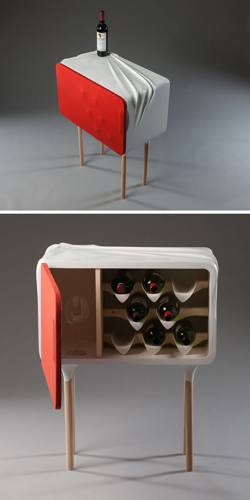 The top of the wine cabinet imitates cloth, allowing the focus to be on the wine bottle while it rests on it. The designer mentions that it’s ‘as if the bottle had been dragged across the surface with a sweeping motion’. The ‘wrinkles’ on the top of the cabinet suggest a place to display the wine bottle.