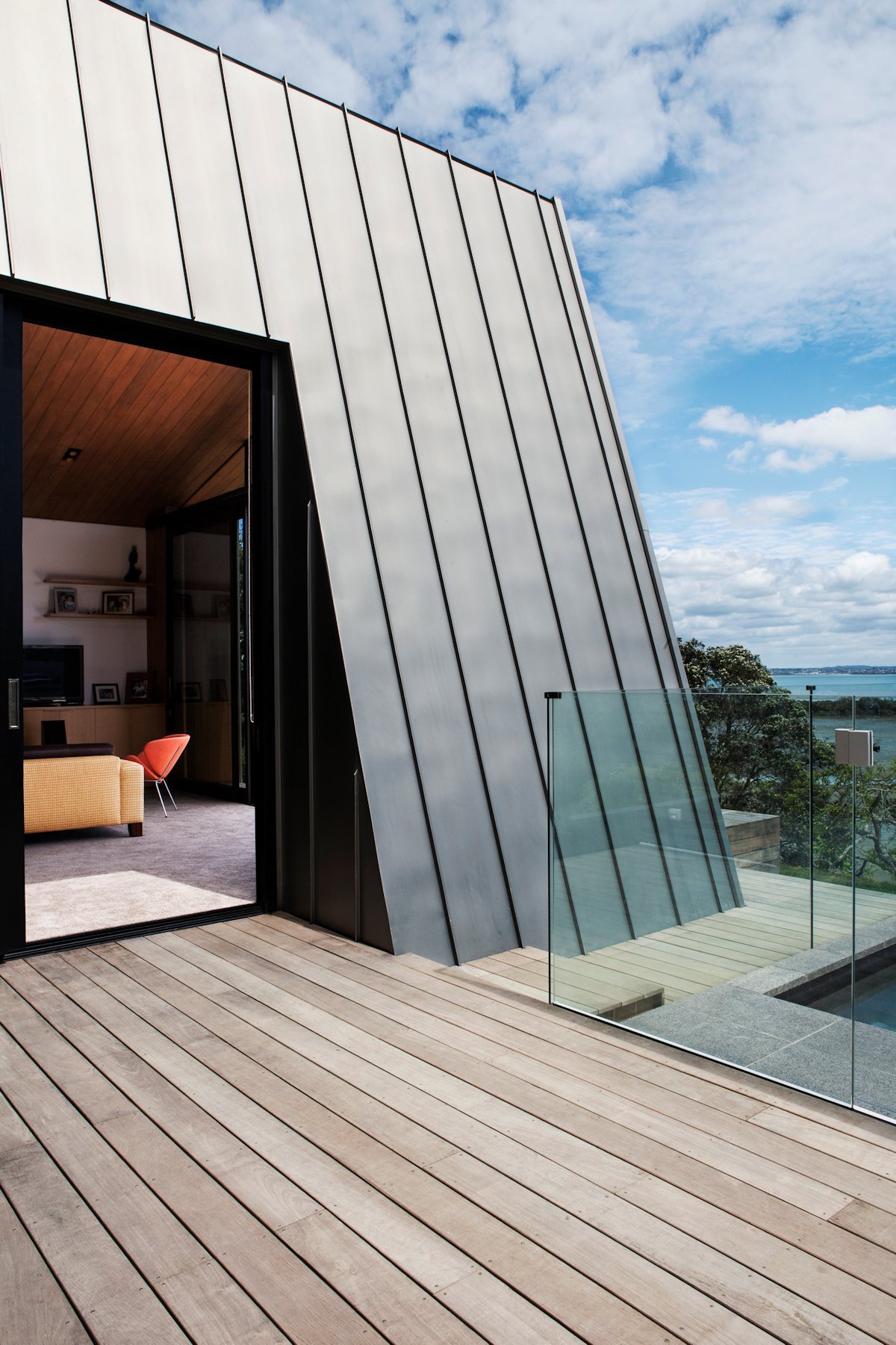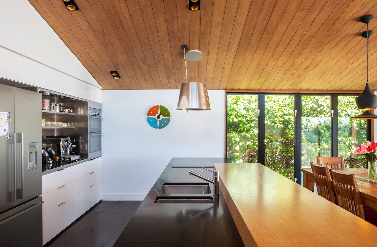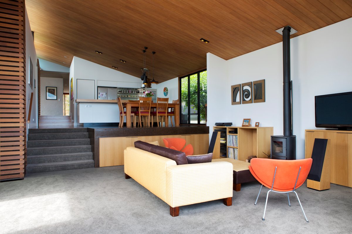 Formally the house comprises two exisiting and two new blocks, linked by the hallway, foyer and stairs. The existing blocks contain two brick-clad and lined bedrooms, an office and an original art deco bathroom. The new blocks contain the living spaces in a zinc-clad apexed void, and the master suite in a cedar-screened block. These sit on a lower level plinth, which houses a guest bedroom, bathroom, laundry and media room.