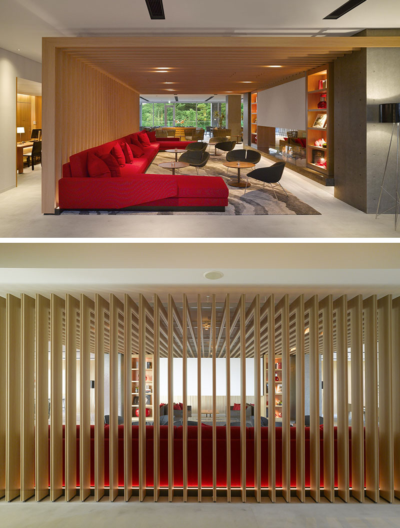 COE Architecture International designed this lounge area for a new spa in Tokyo. The lounge takes advantage of views at either end, with floor-to-ceiling windows. The center of the bright, open room however, is where they’ve done something interesting.