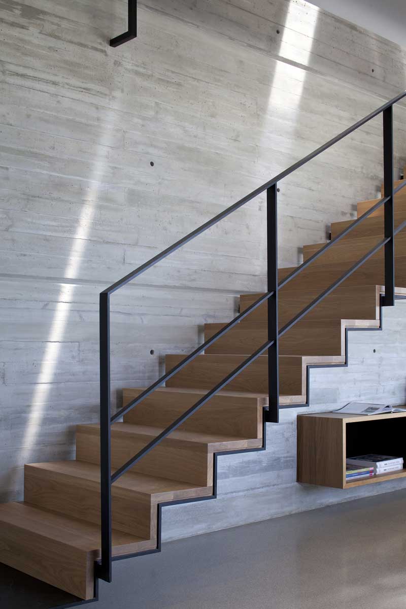 The raw materials and the attempt to create an architecture that was both unfashionable and timeless is complemented by the books and pieces of art hung throughout the apartment including works by the artist Guy Yanai.