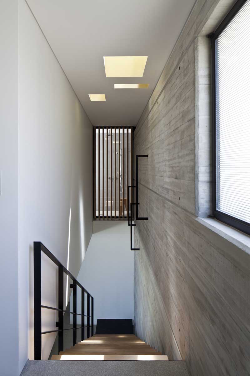 The space created by the new stairwell, divides the movement and the axis of the existing space in a way that creates a dramatic architectural cross section through the apartment, links the different levels and allows natural light to penetrate the building through glass skylights inserted into the roof of the upper floor. The new cross section creates a double space with transparent glass and a system of moveable wooden slats that makes it possible to create a view between the spaces or to allow privacy and natural light control.