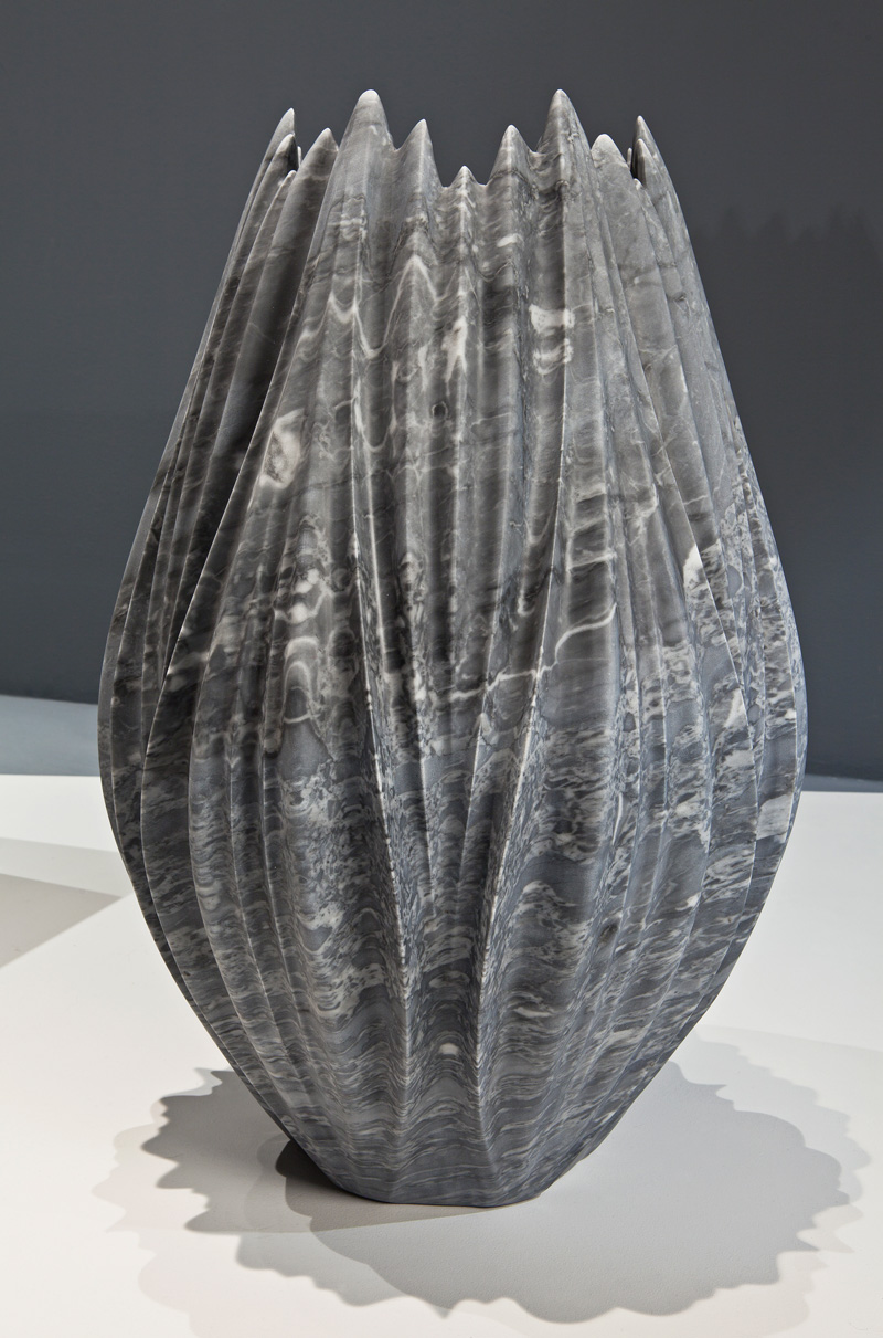 The Tau vases appear organic; emerging as a series of intricately rendered pleats expressing the formal complexity of natural growth systems. Seemingly as delicate as flower petals, the fragile aesthetic of the vases belies the solidity of their material.