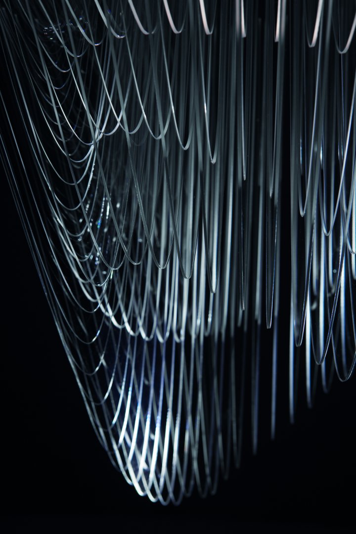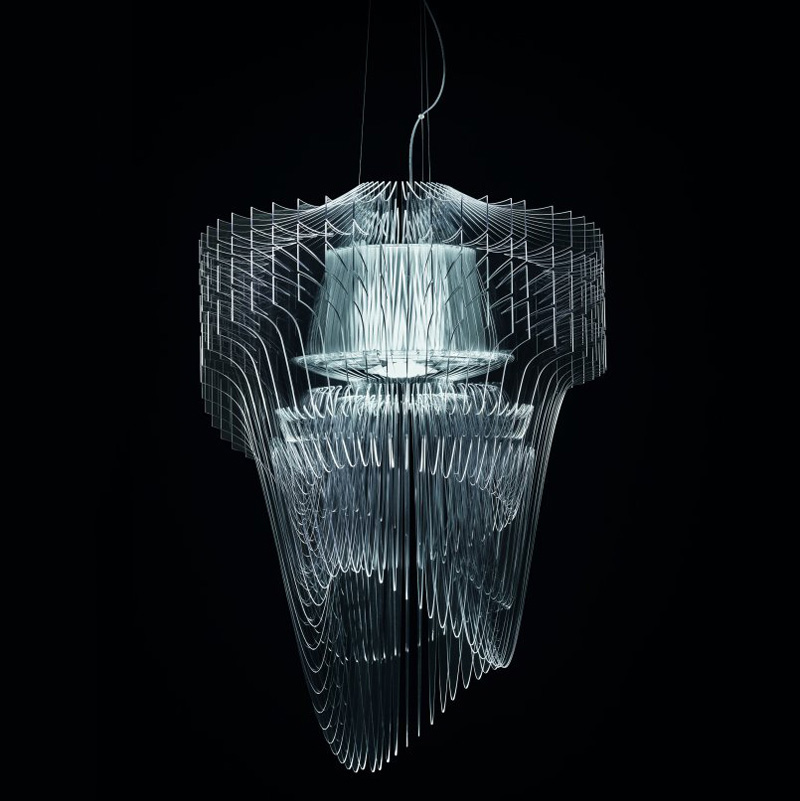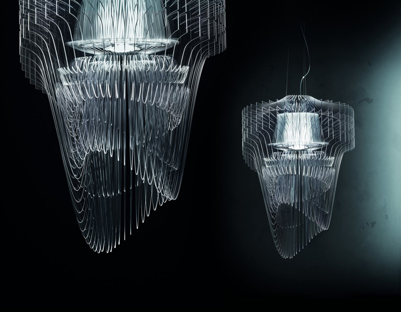 Zaha Hadid worked together with Patrik Schumacher to design the Aria Transparent Chandelier for the manufacturer SLAMP.