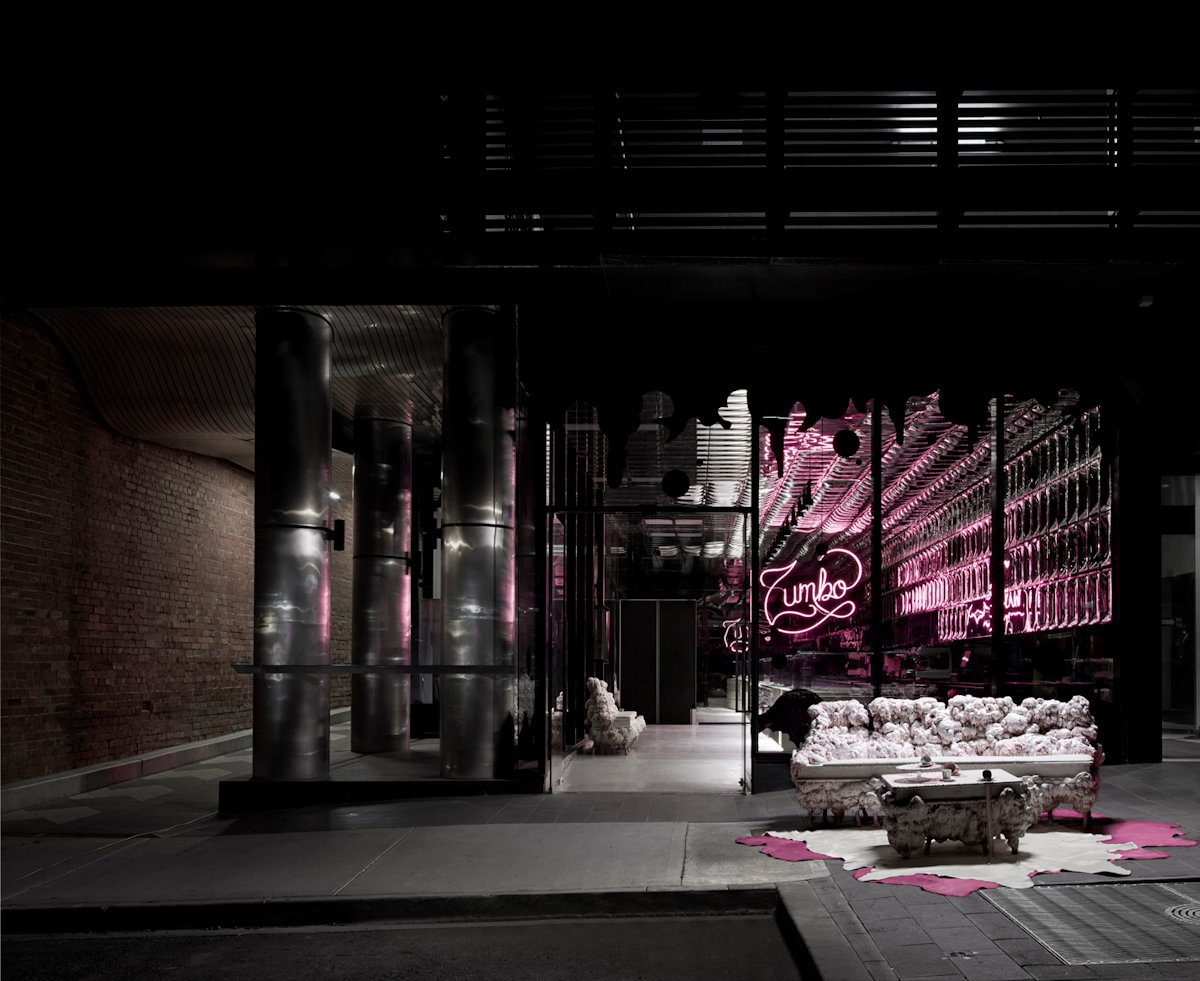 The brief was simple – stay true to the Zumbo brand and use a bit of pink – so the design team took matters into their own hands. They expanded the response to include the graphic design for signage and lighting as well as custom-designed furniture, creating a delectable fantasy world with a slightly kinky twist – classic Zumbo and classic Elenberg Fraser.