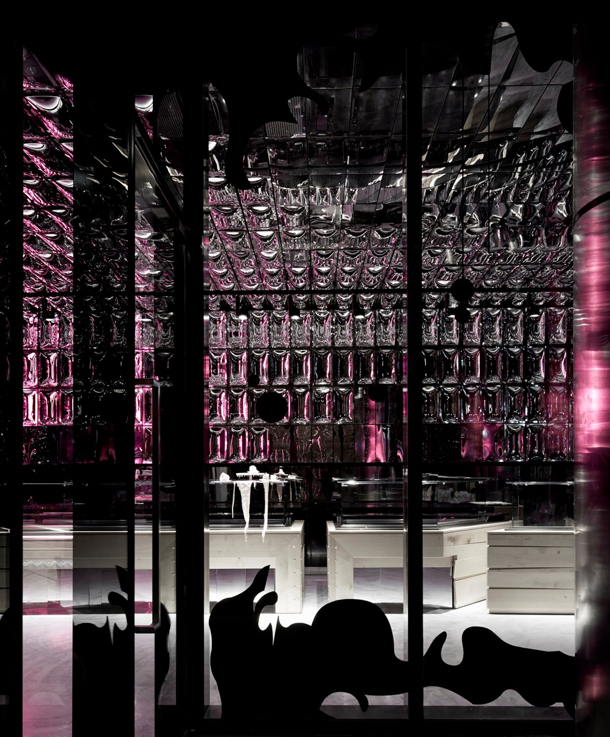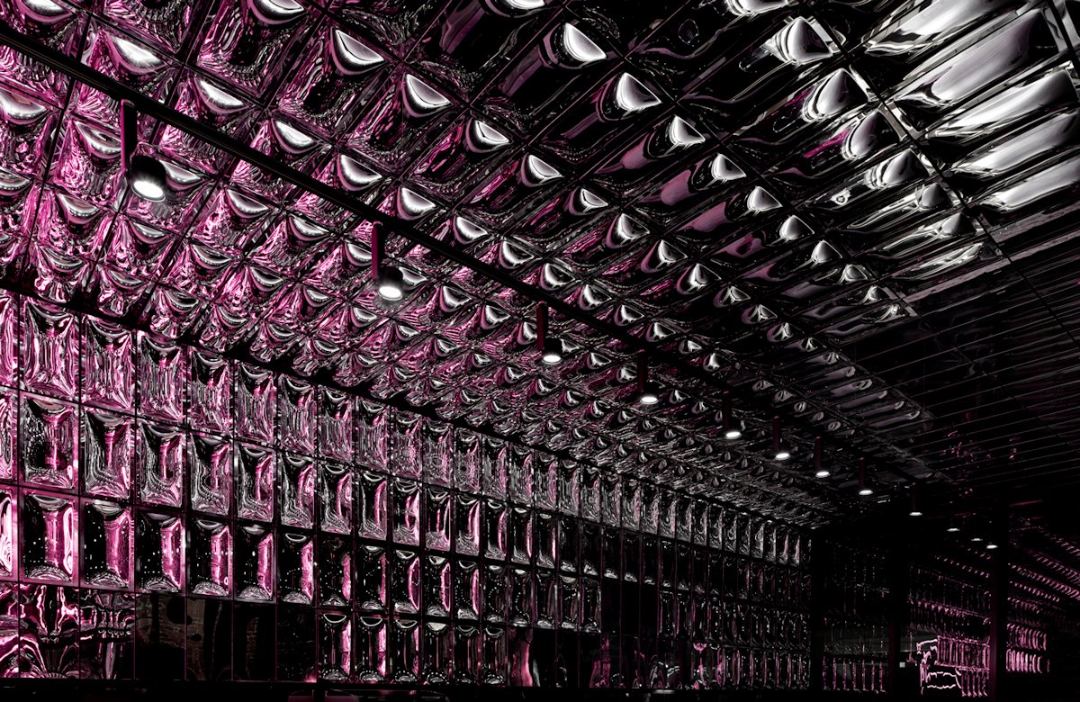 Amplifying the effect are the mirrored plastic wall panels, which give the feeling of infinite depth. These were vacuum-formed and metallised, and then treated with aluminium vapour to achieve the reflective finish and installed by the design team.