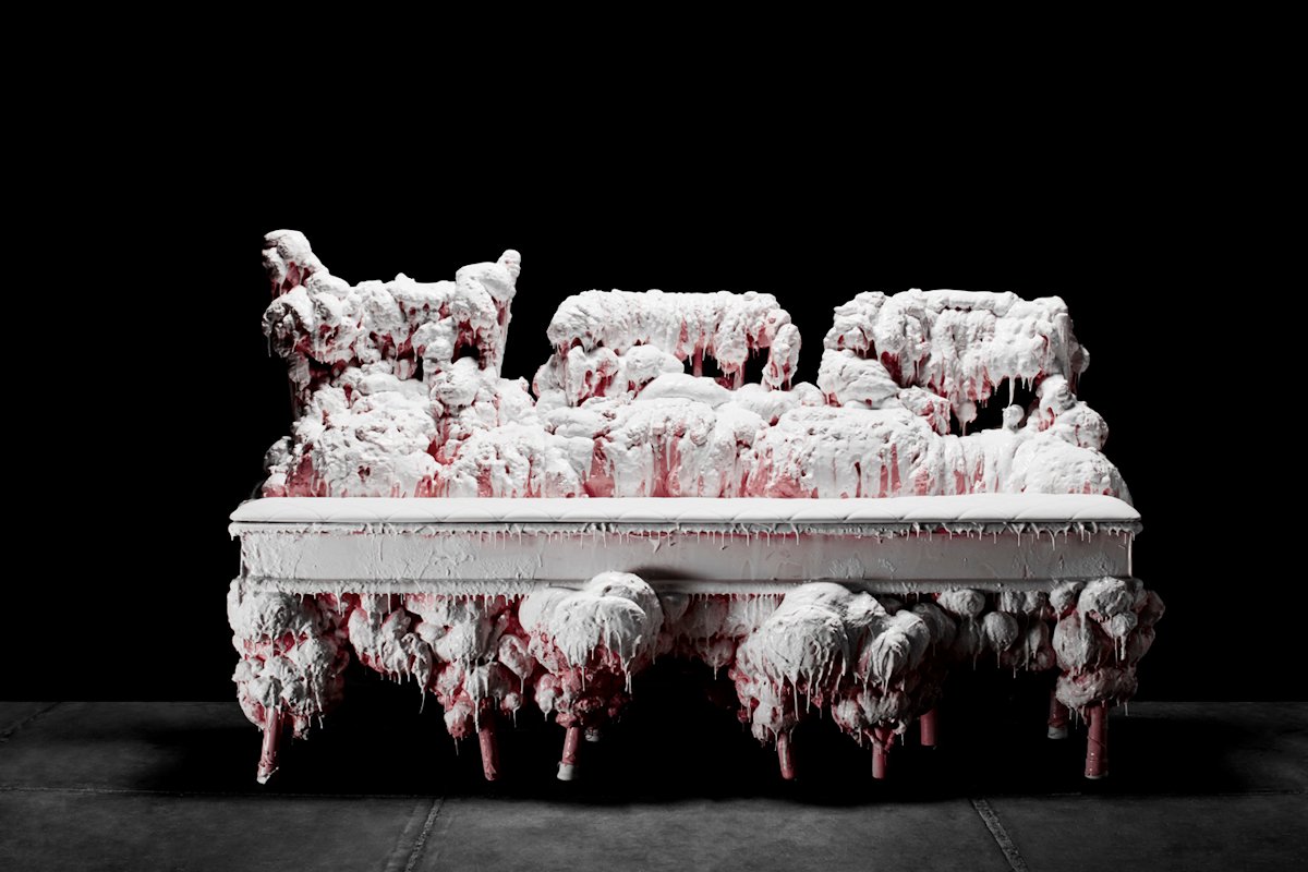 We took the experimentation to the next level with the furniture – up-cycling old pieces and transforming them into larger than- life confectionary creations by adding self-expanding foam and dipping them in pink and white silicone. Sit on these and let your imagination run wild – are they melted marshmallows or dripping icecream?